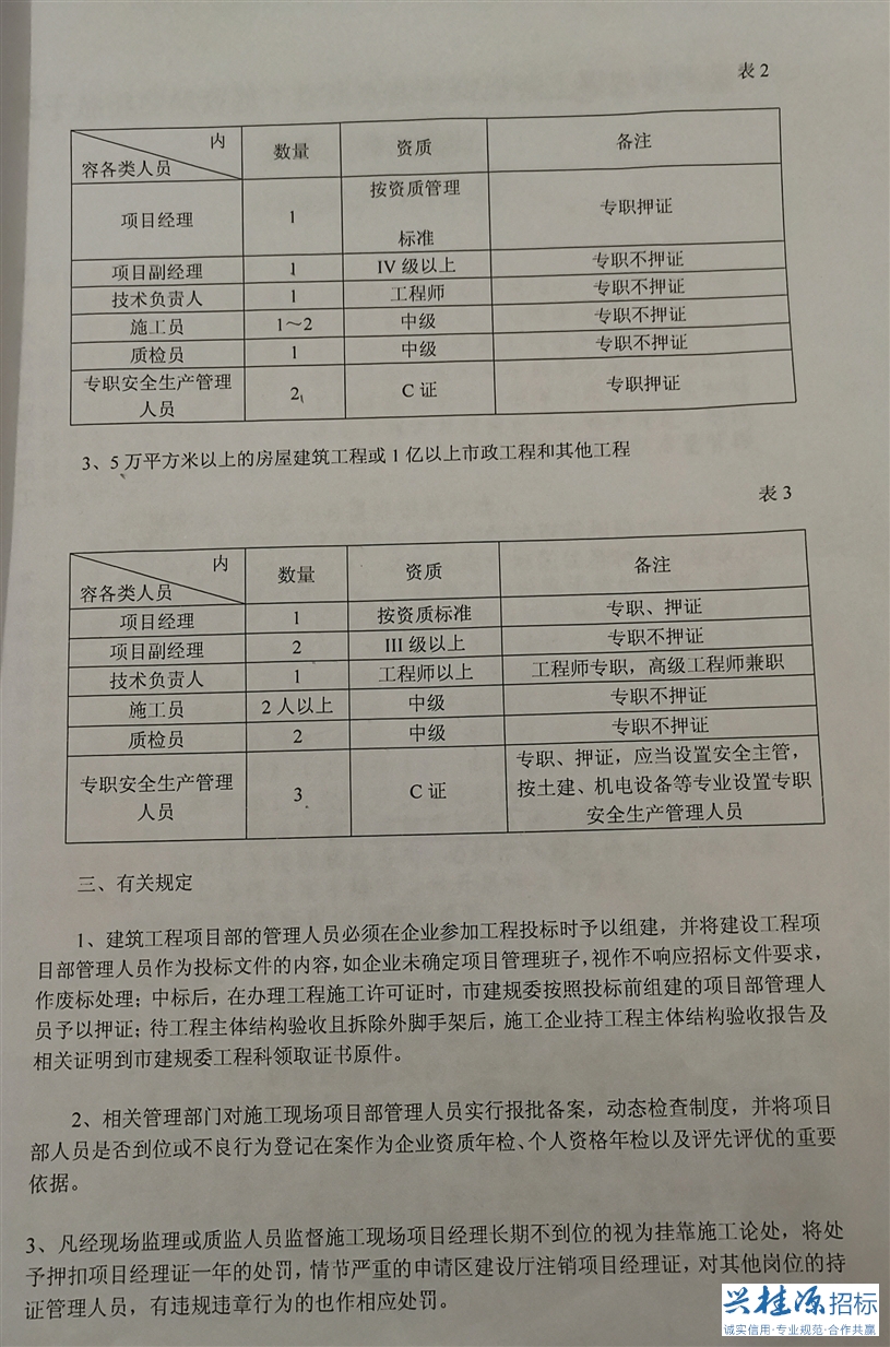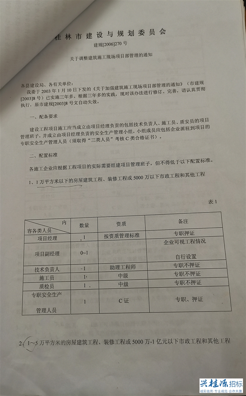 3、桂林建設(shè)與規(guī)劃委員會(huì)建規(guī)【2006】270號(hào)《關(guān)于調(diào)整建筑施工現(xiàn)場(chǎng)項(xiàng)目部管理的通知》詳見(jiàn)公告附件1。